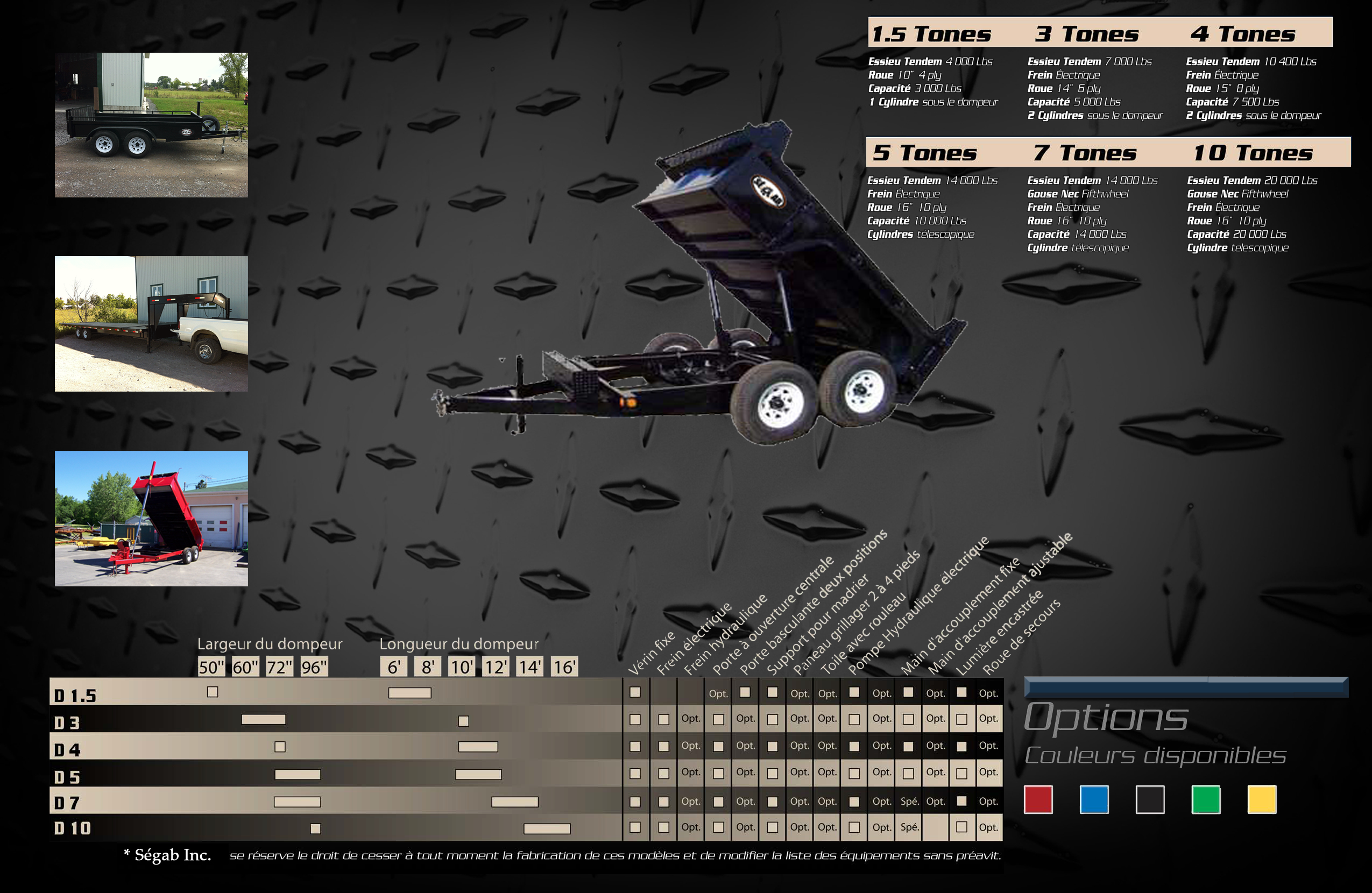 Options; Frein hydraulique Porte basculante 2 positions Panneau grillager 2 à 4 pieds Toile avec rouleau Batterie Main d'accouplement ajustable Roue de secours